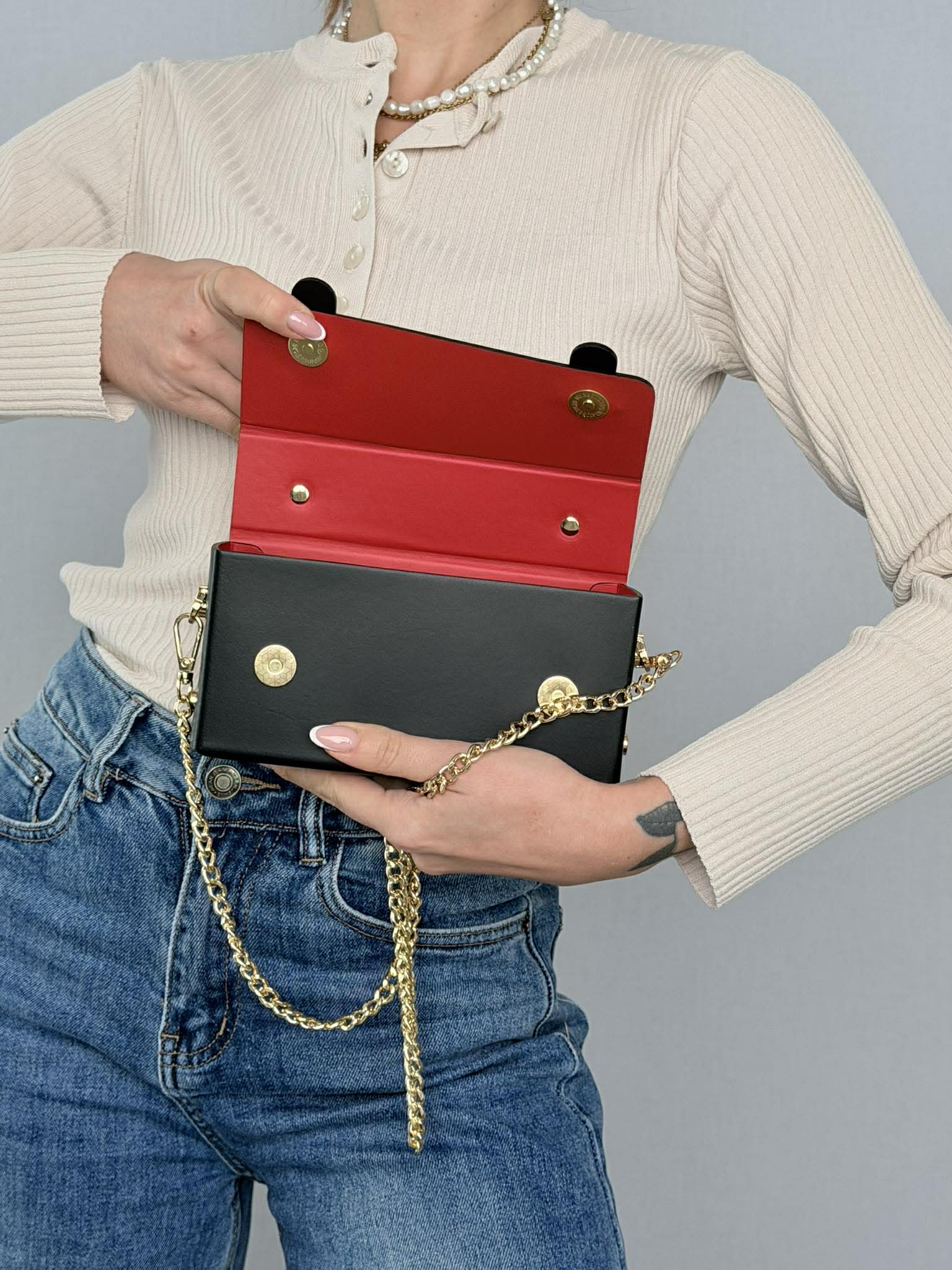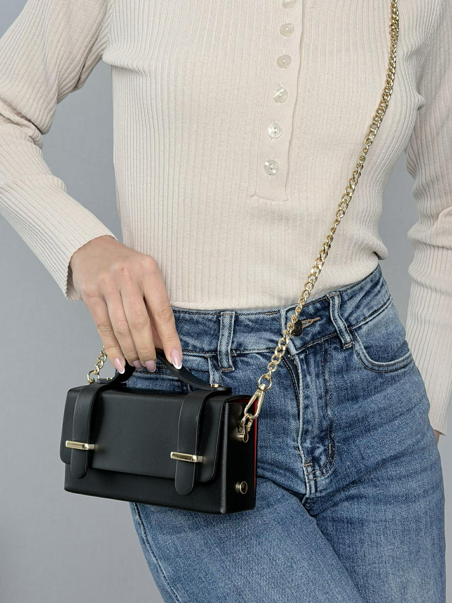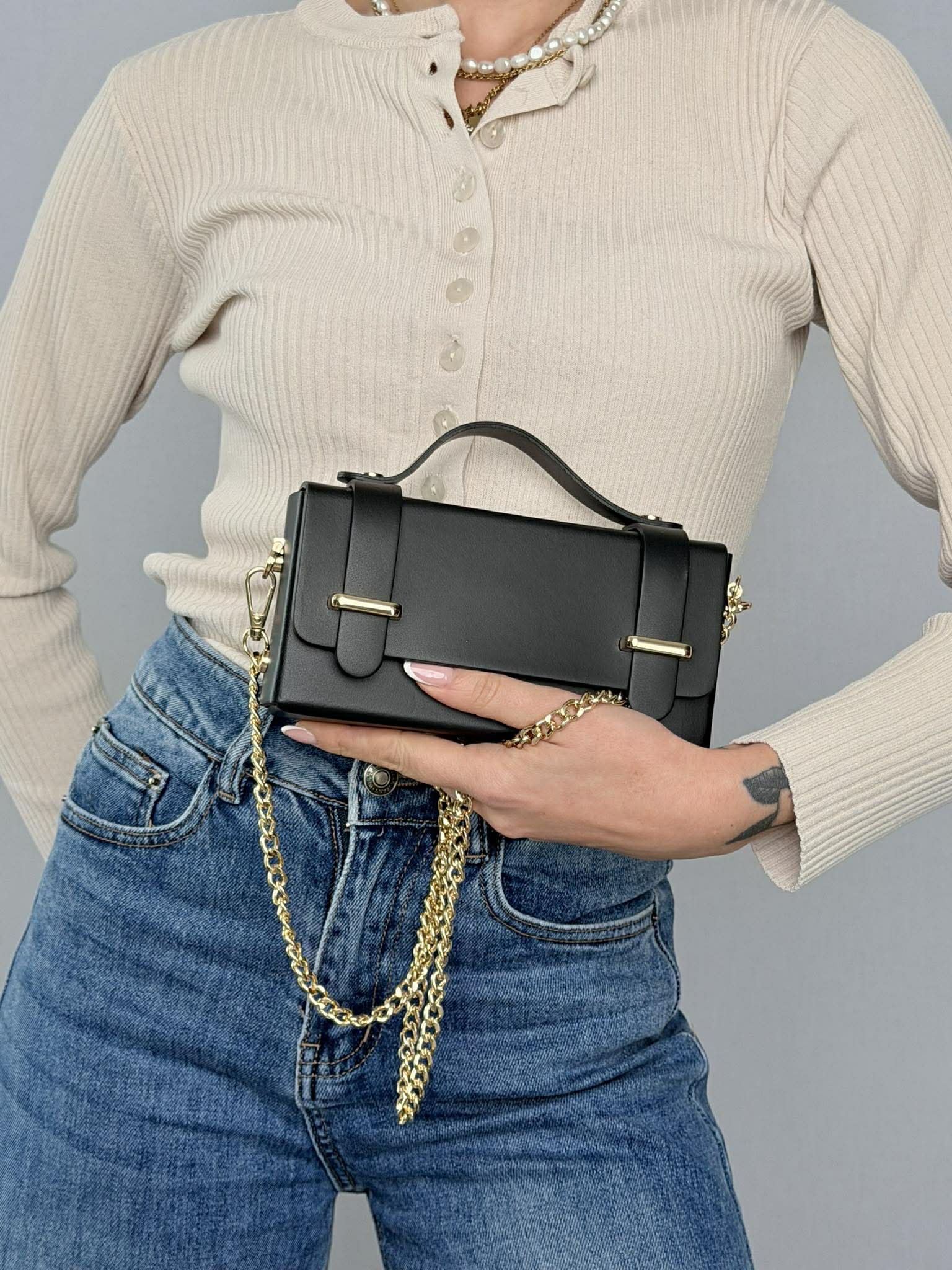Accessori metallici color oro.