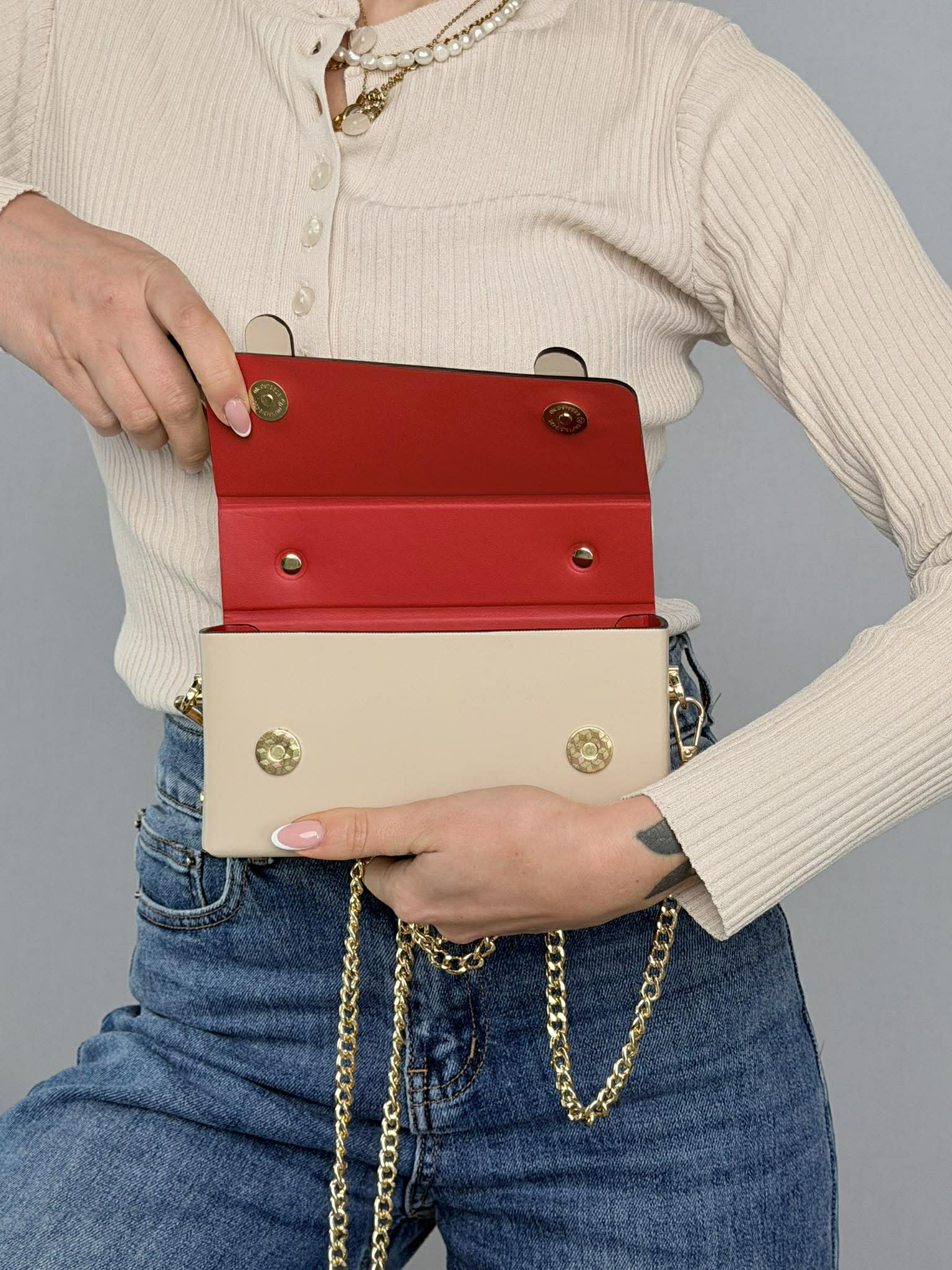 Accessori metallici color oro.