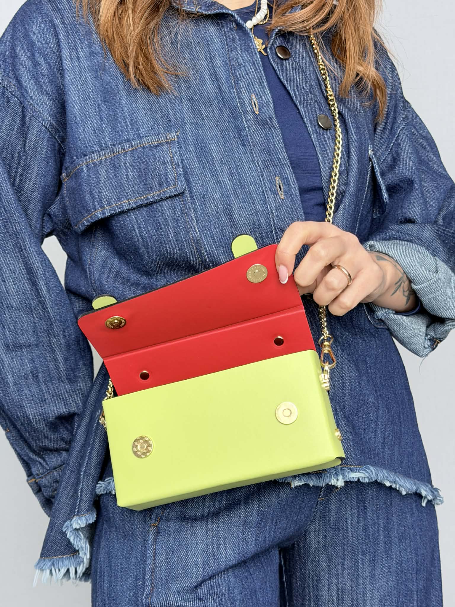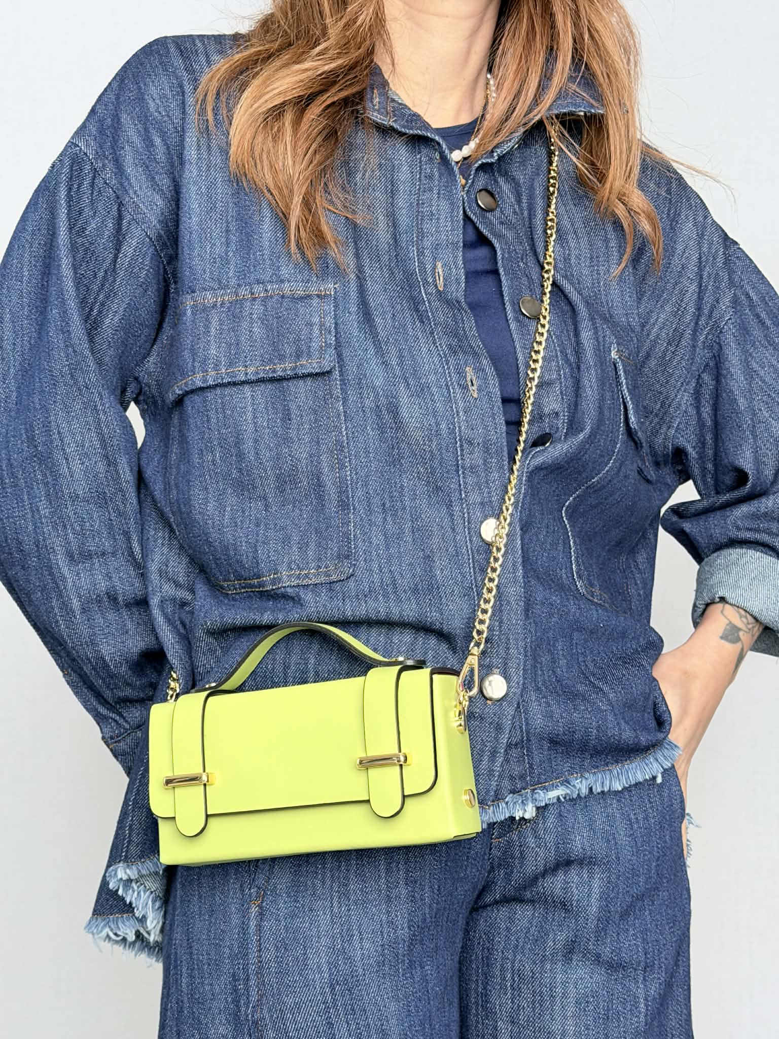 Accessori metallici color oro.