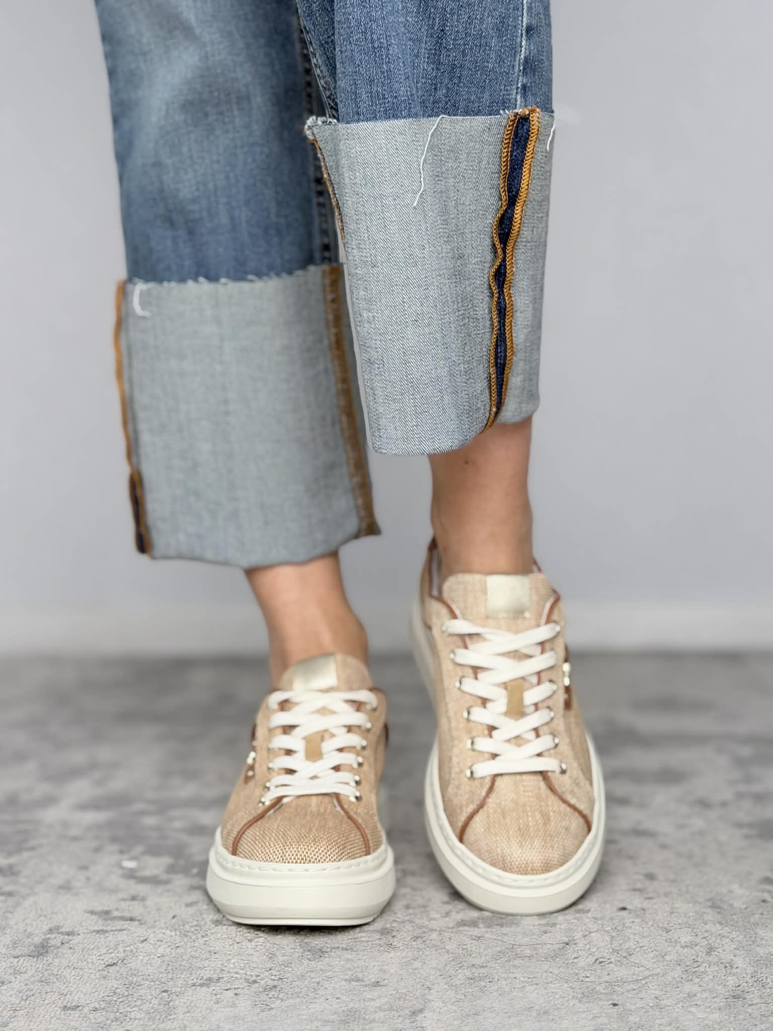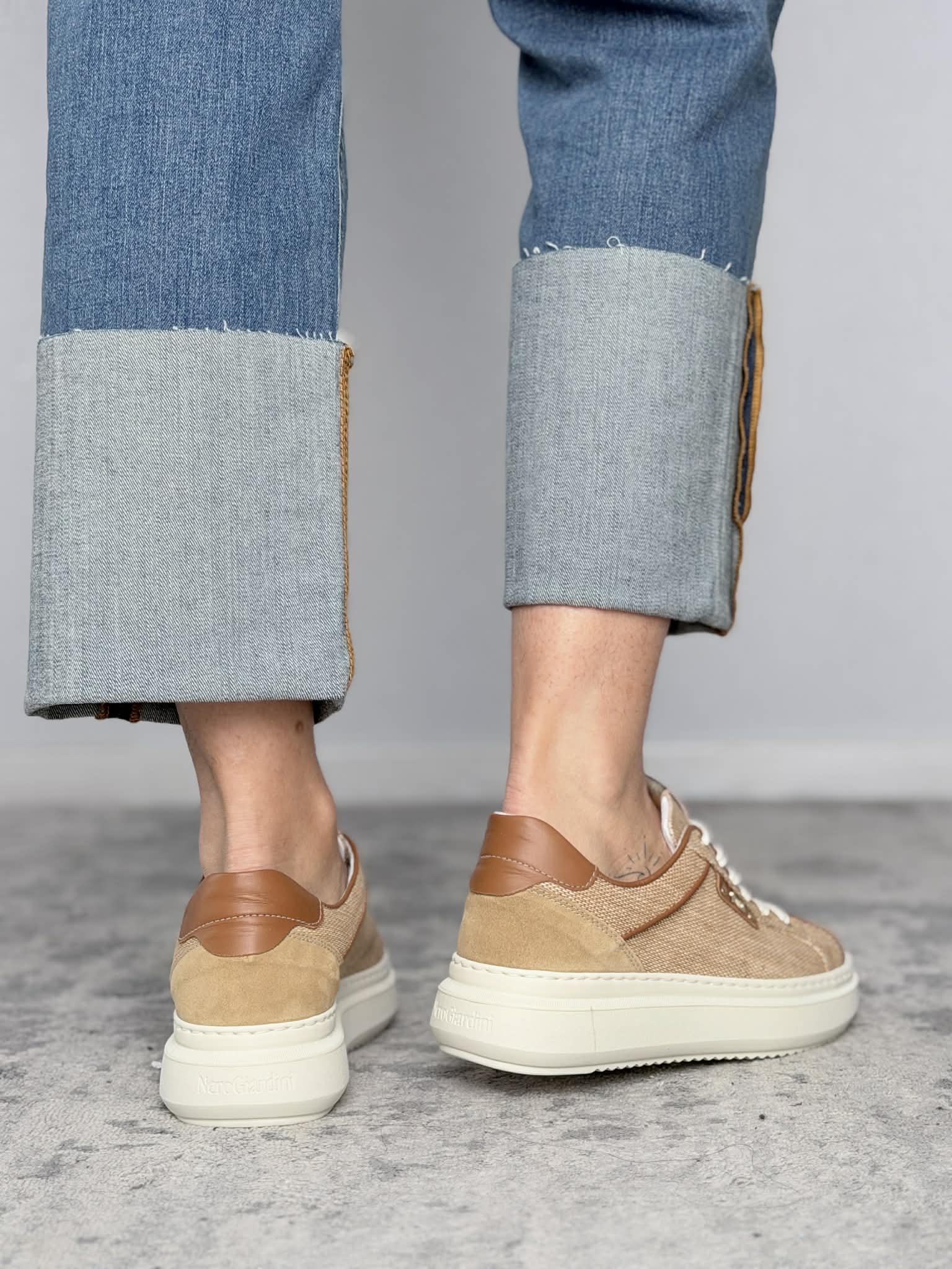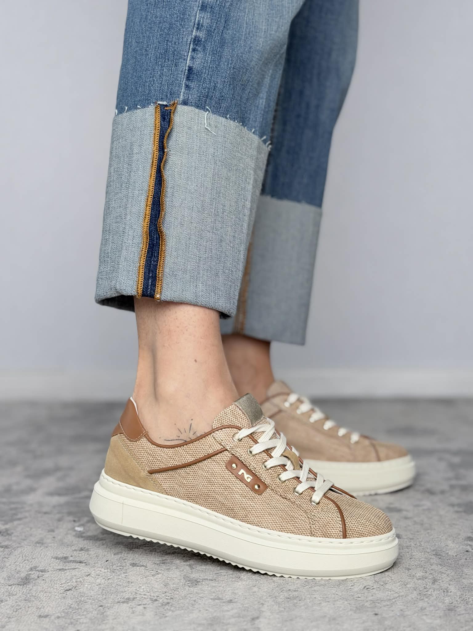 Sneakers Nero Giardini realizzate in tessuto effetto paglia ambra con elementi in pelle marrone.