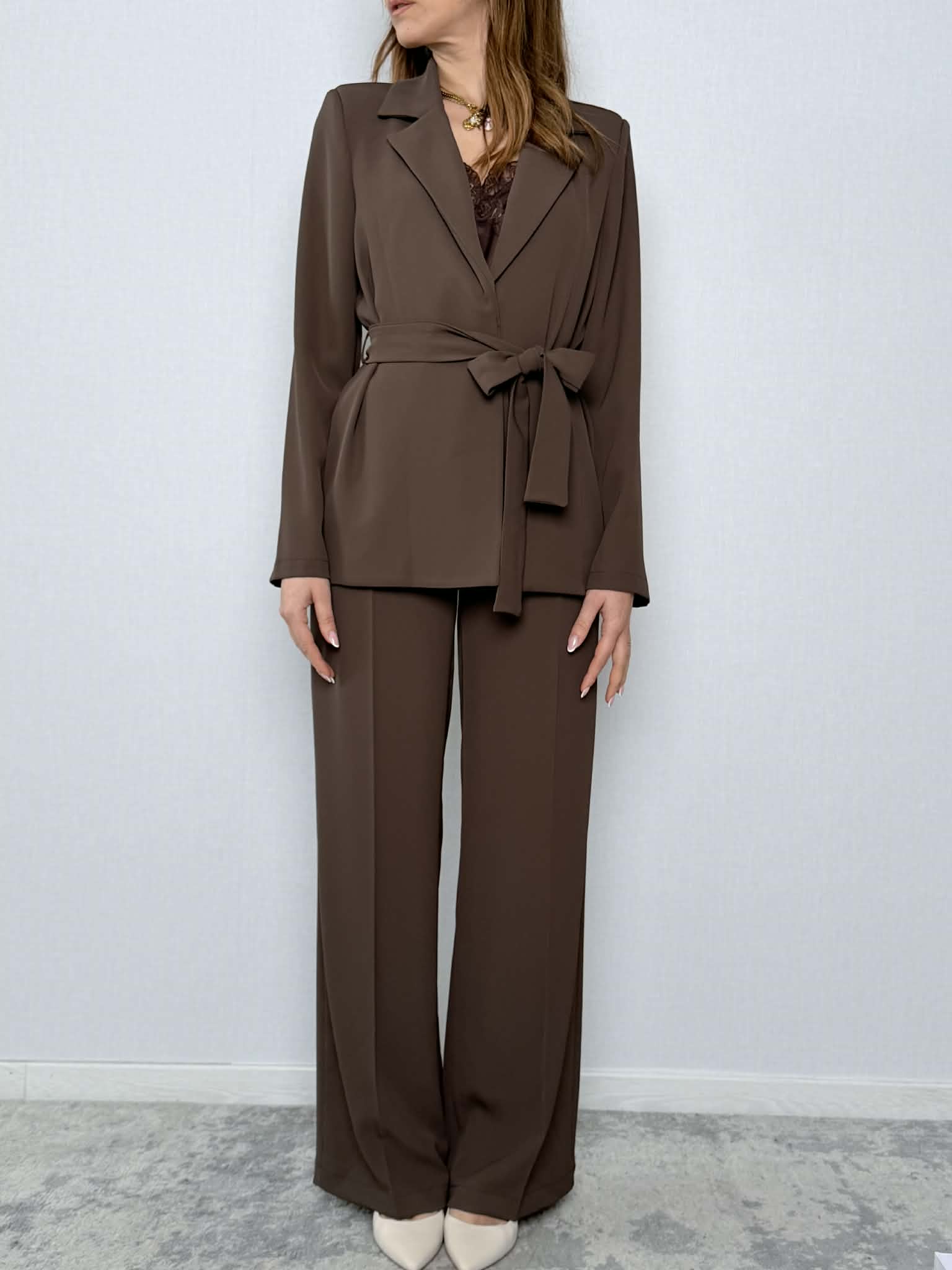 Completo fiocco SuSy Mix mod. 303211 composta da giacca e pantalone color moro.