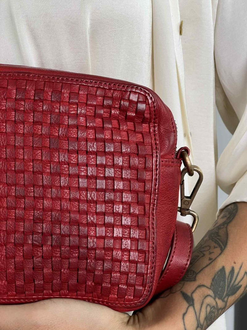 CameraBag in morbida pelle intracciata di vitello lavato e tinto in capo color Bordeaux.