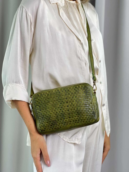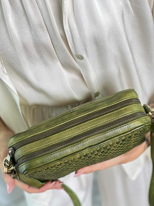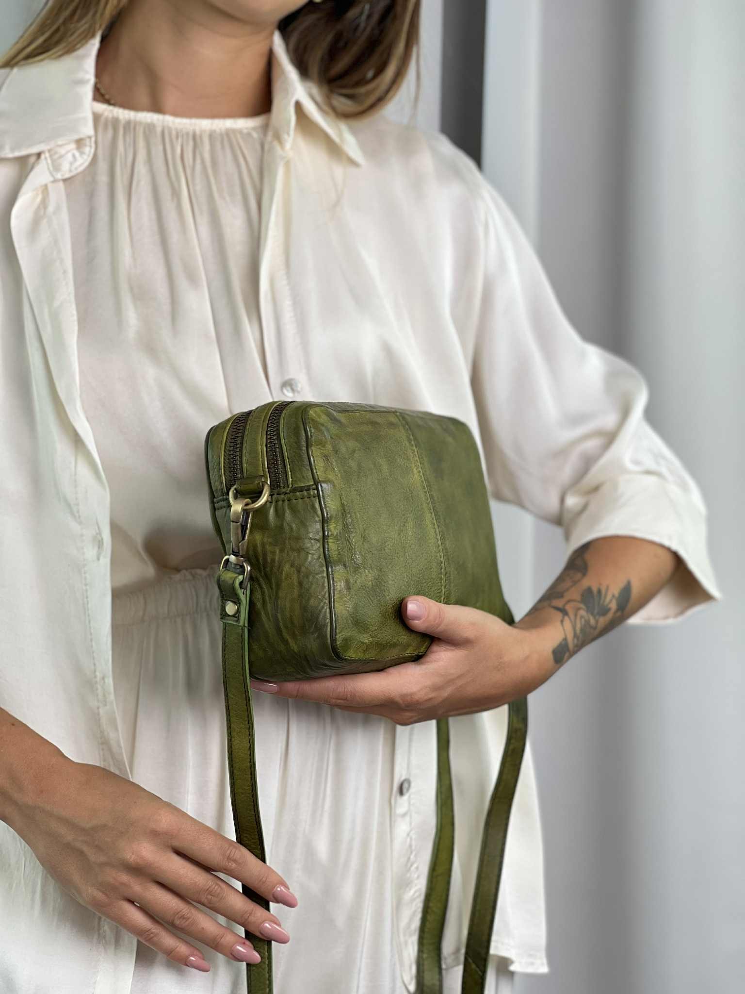 CameraBag in morbida pelle intracciata di vitello lavato e tinto in capo color Verde.