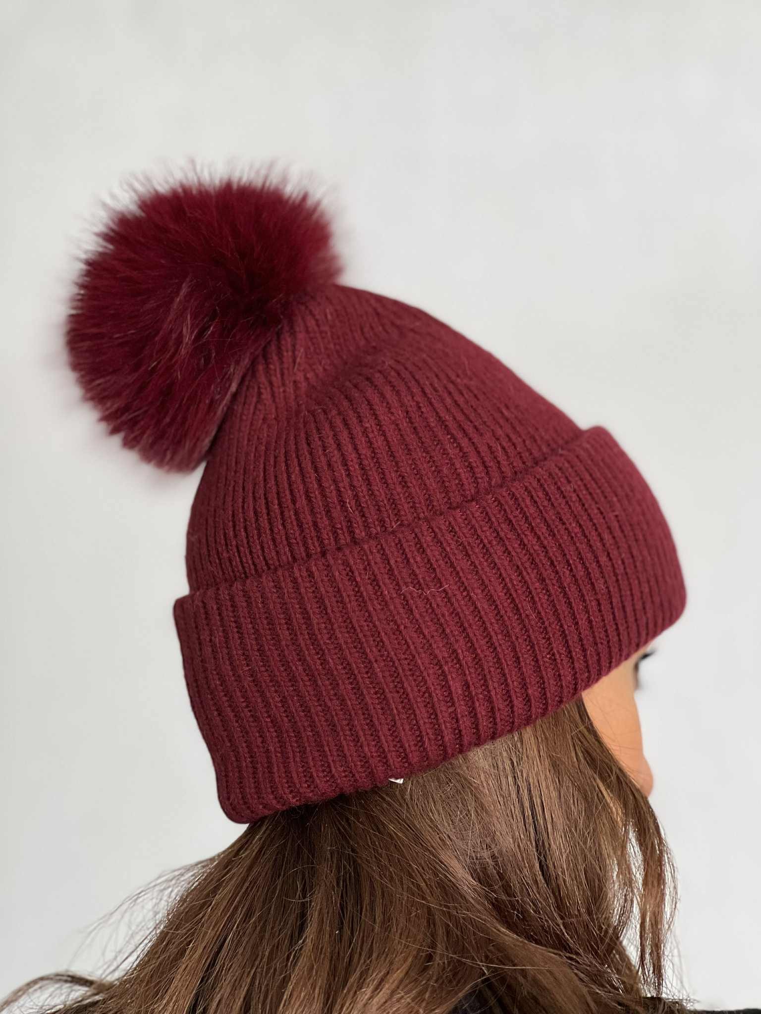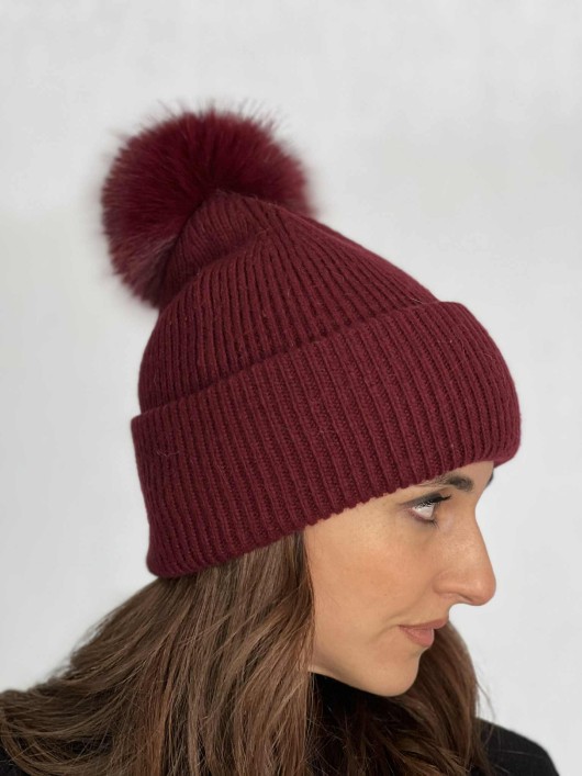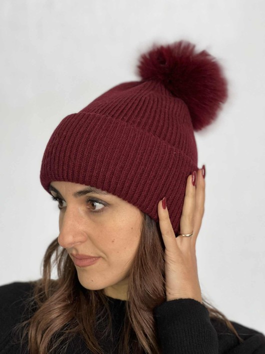 Cuffia con pon pon staccabile color Bordeaux.