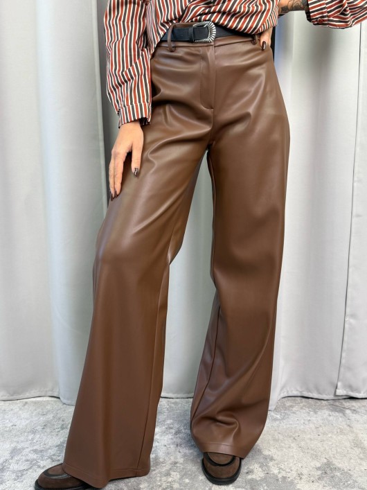 Pantalone palazzoHaveOne in ecopelle color moro, con mezzo elastico in vita.