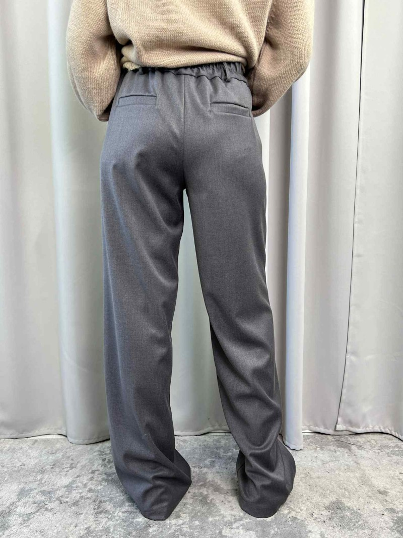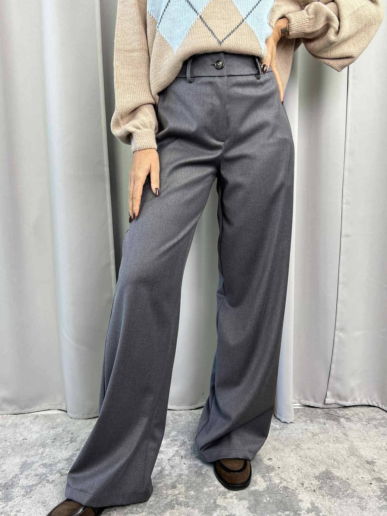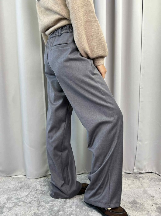 Pantalone palazzo senza pinces con classica chiusura su patta ed arriccio sul retro.
