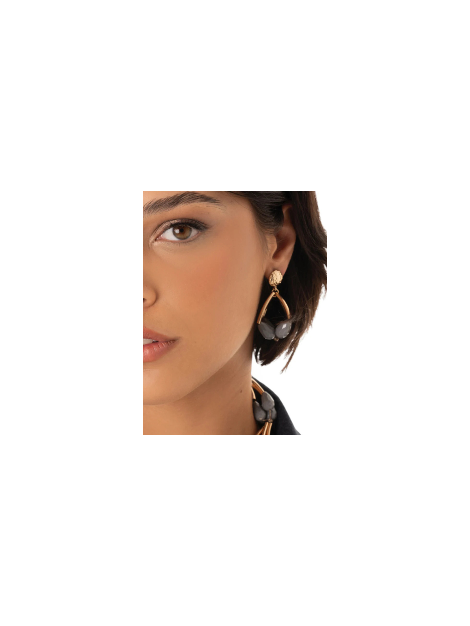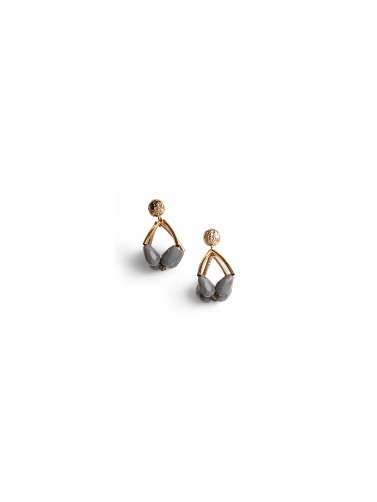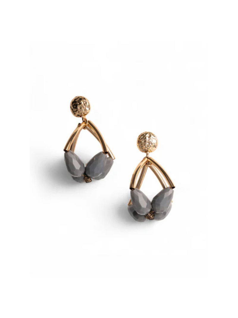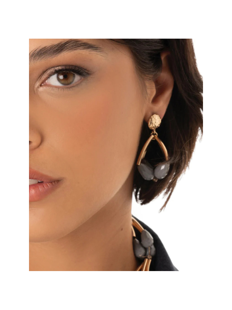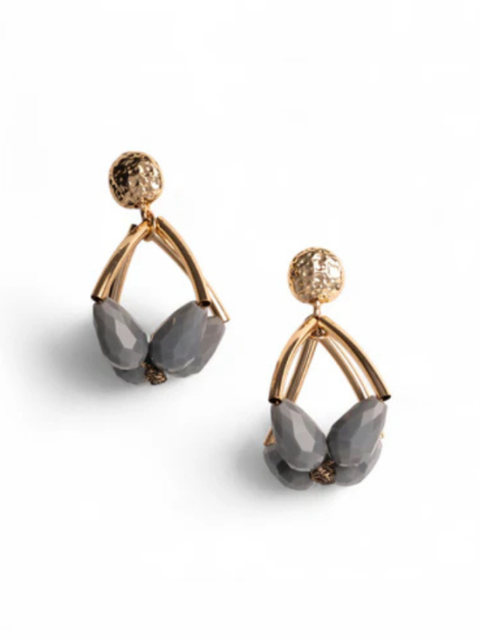 Orecchino pendenti in metallo con pietre a goccia in vetro grigio.