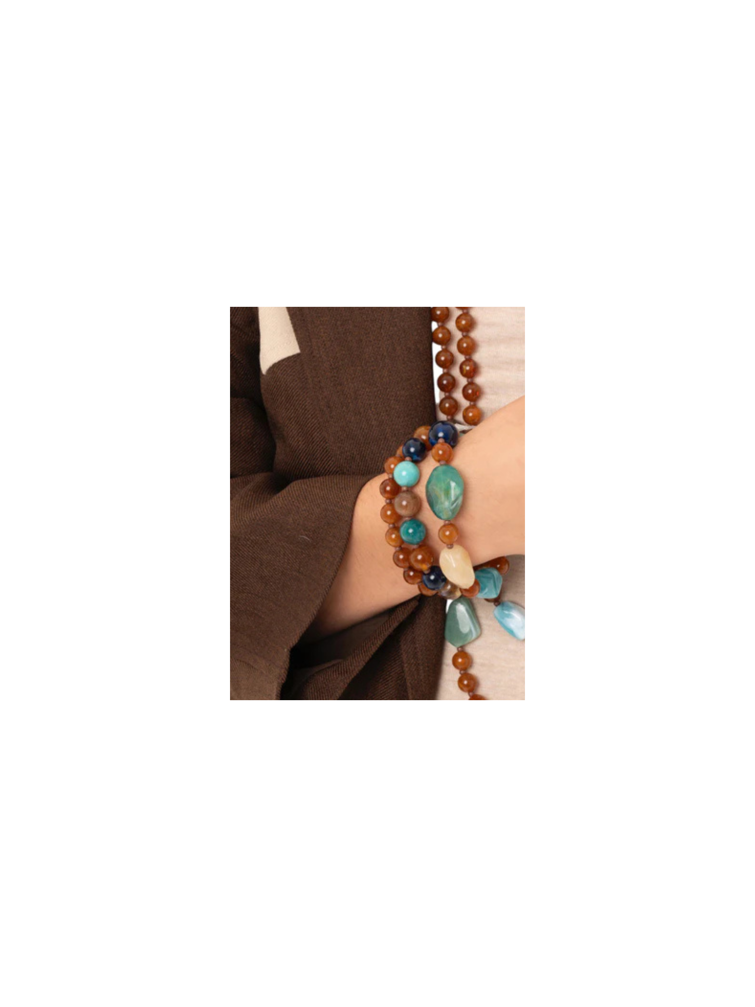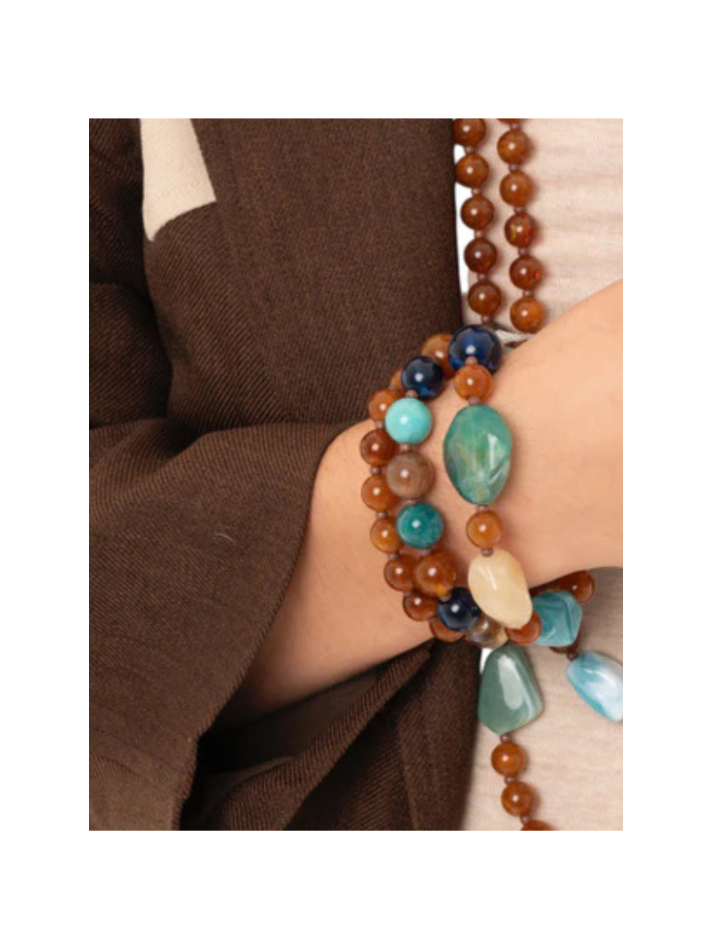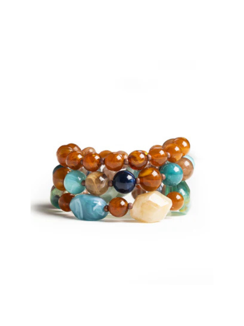 Bracciale elastico a 3 fili con pietre in acrilico e vetro tono marrone.