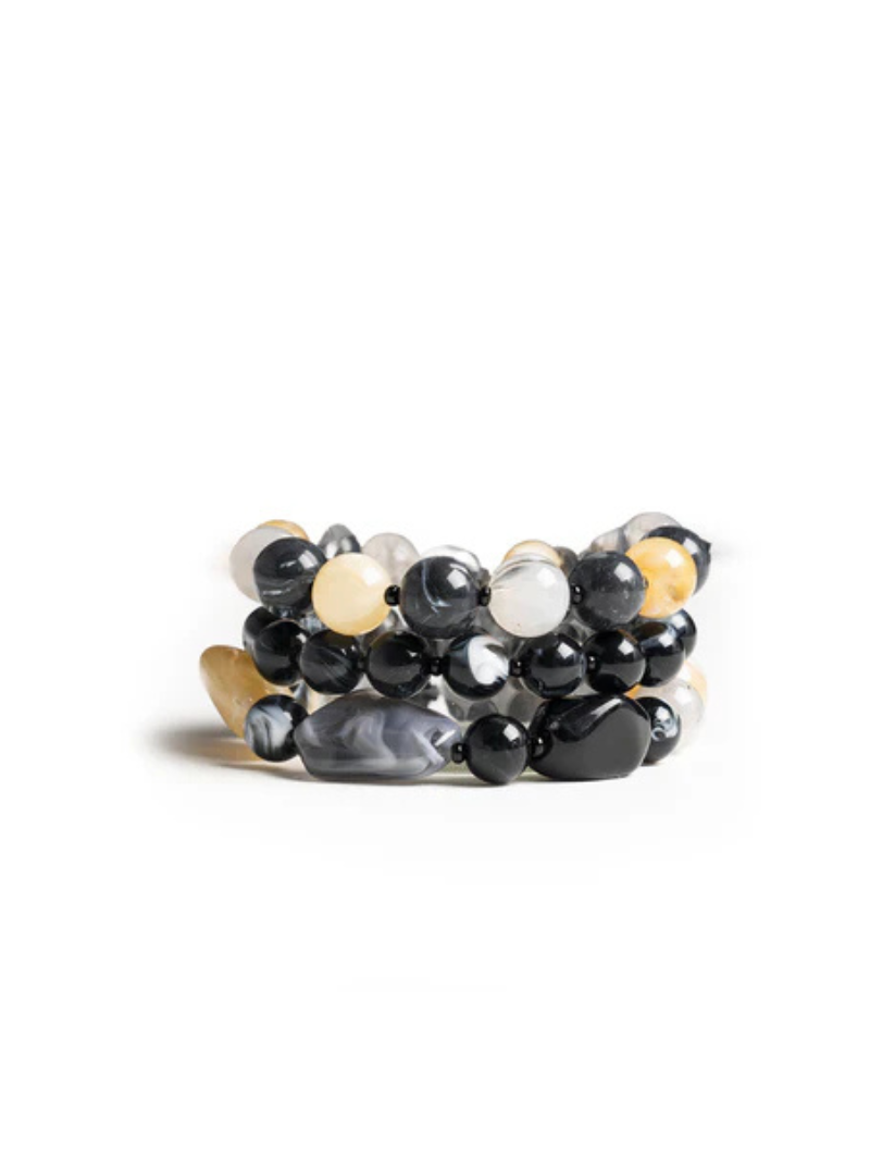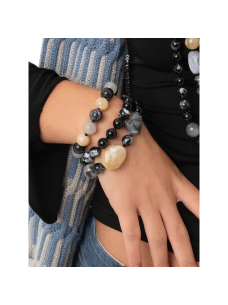 Bracciale elastico a 3 fili con pietre in resina,acrilico e vetro tono nero.