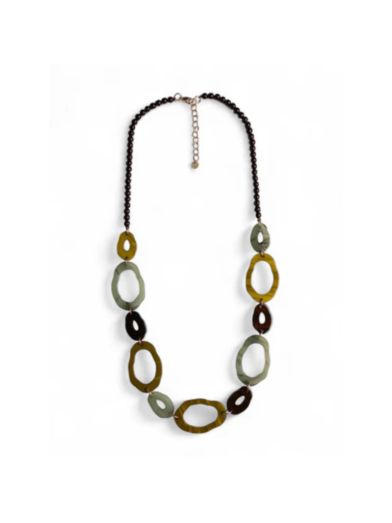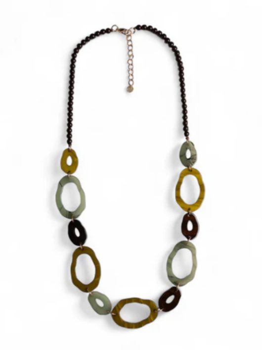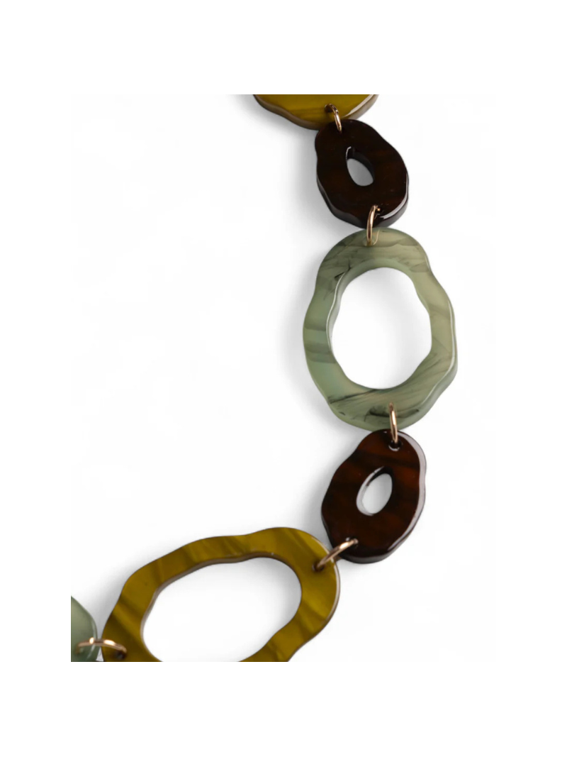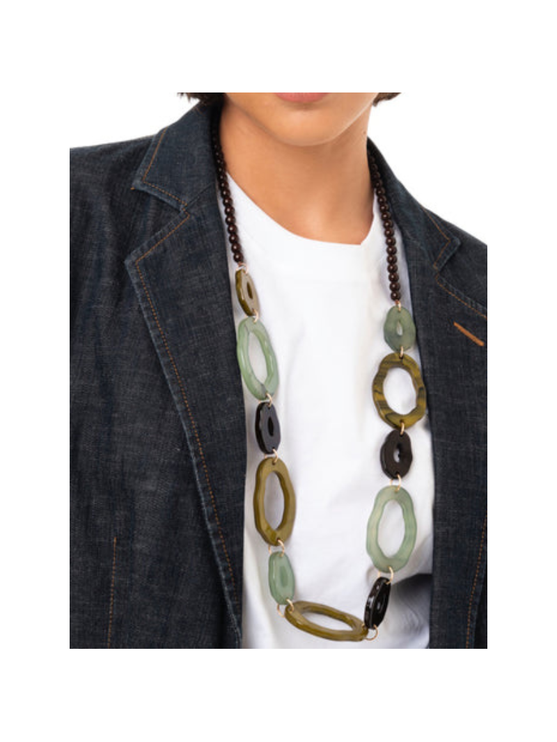 Collana lunga in acrilico con inserti tono verde.