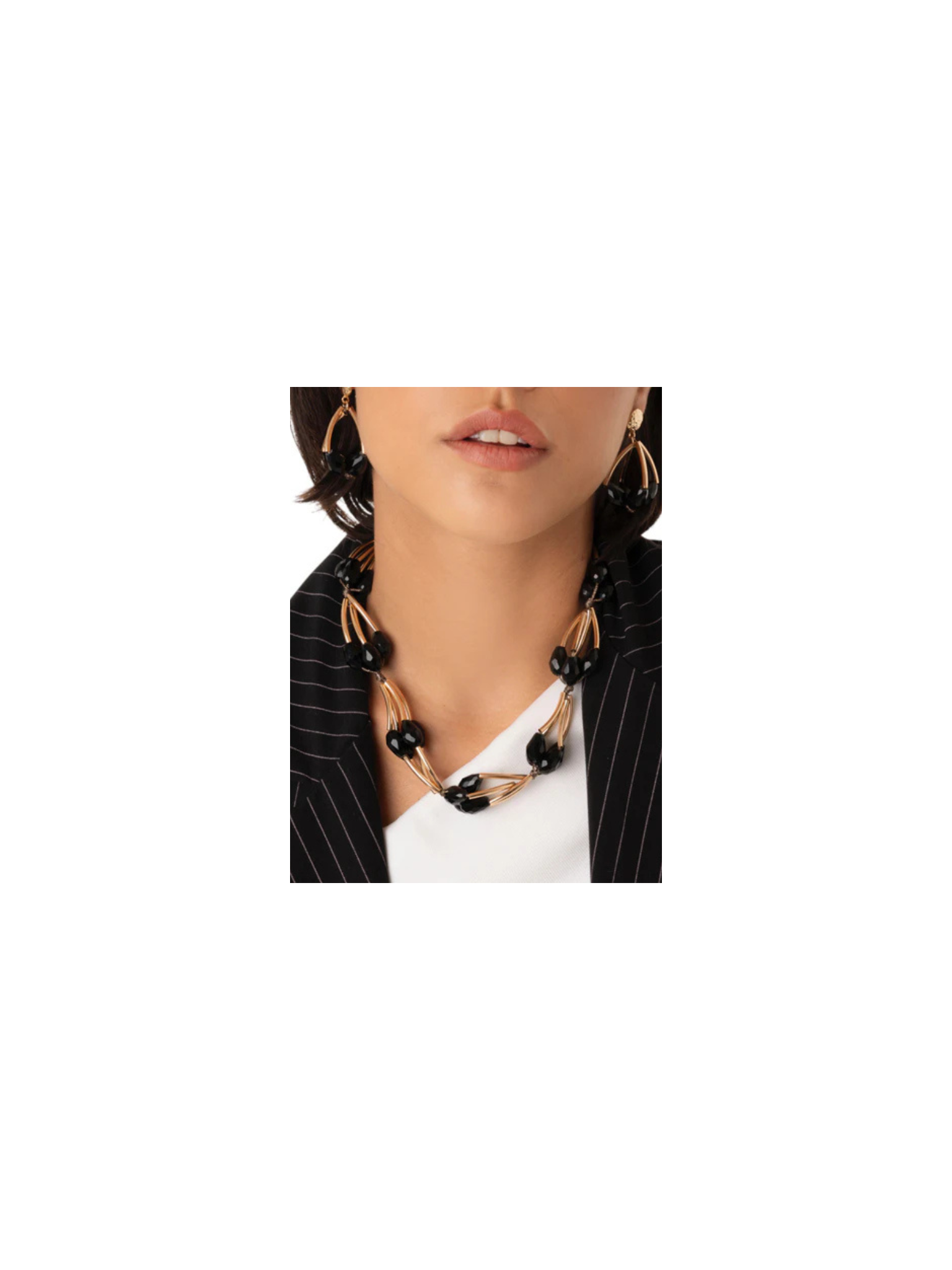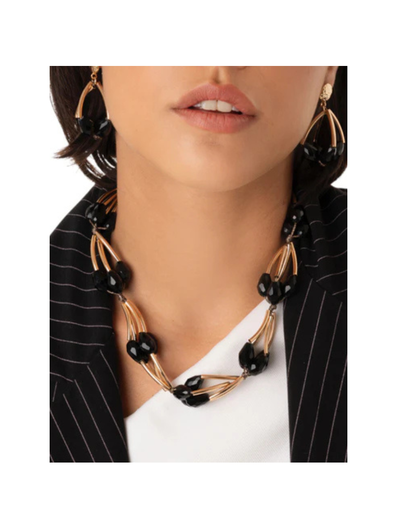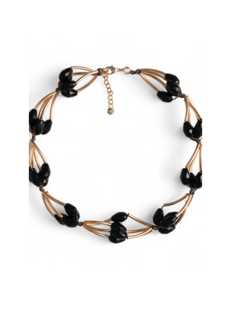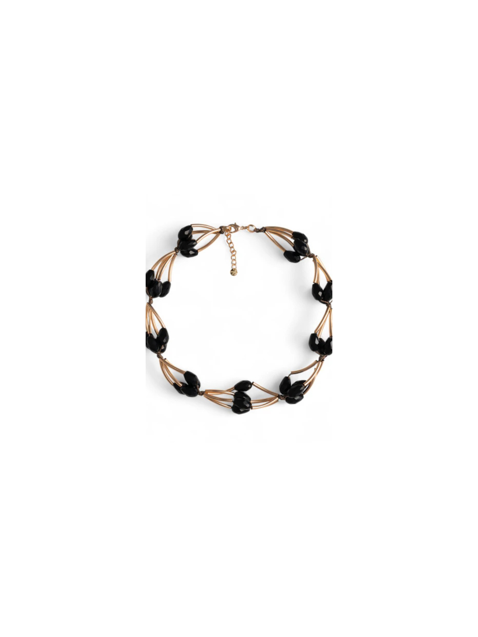 Collana girocollo strutturato in metallo con pietre in vetro nero.