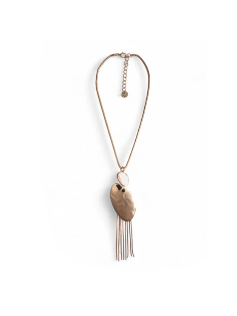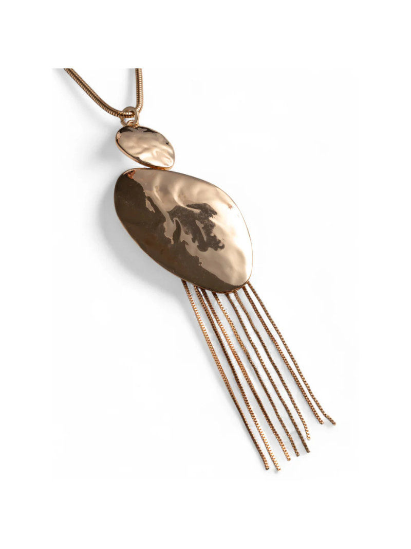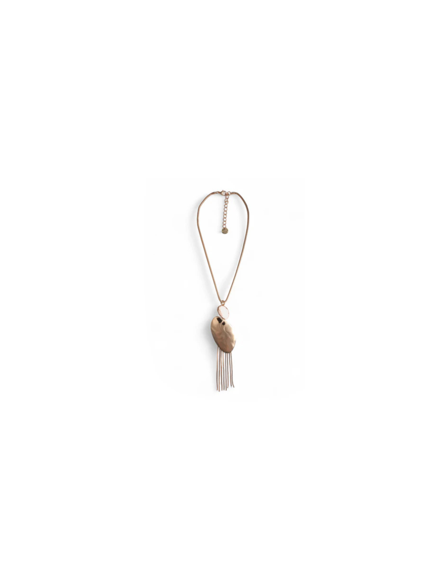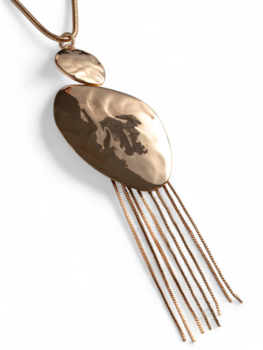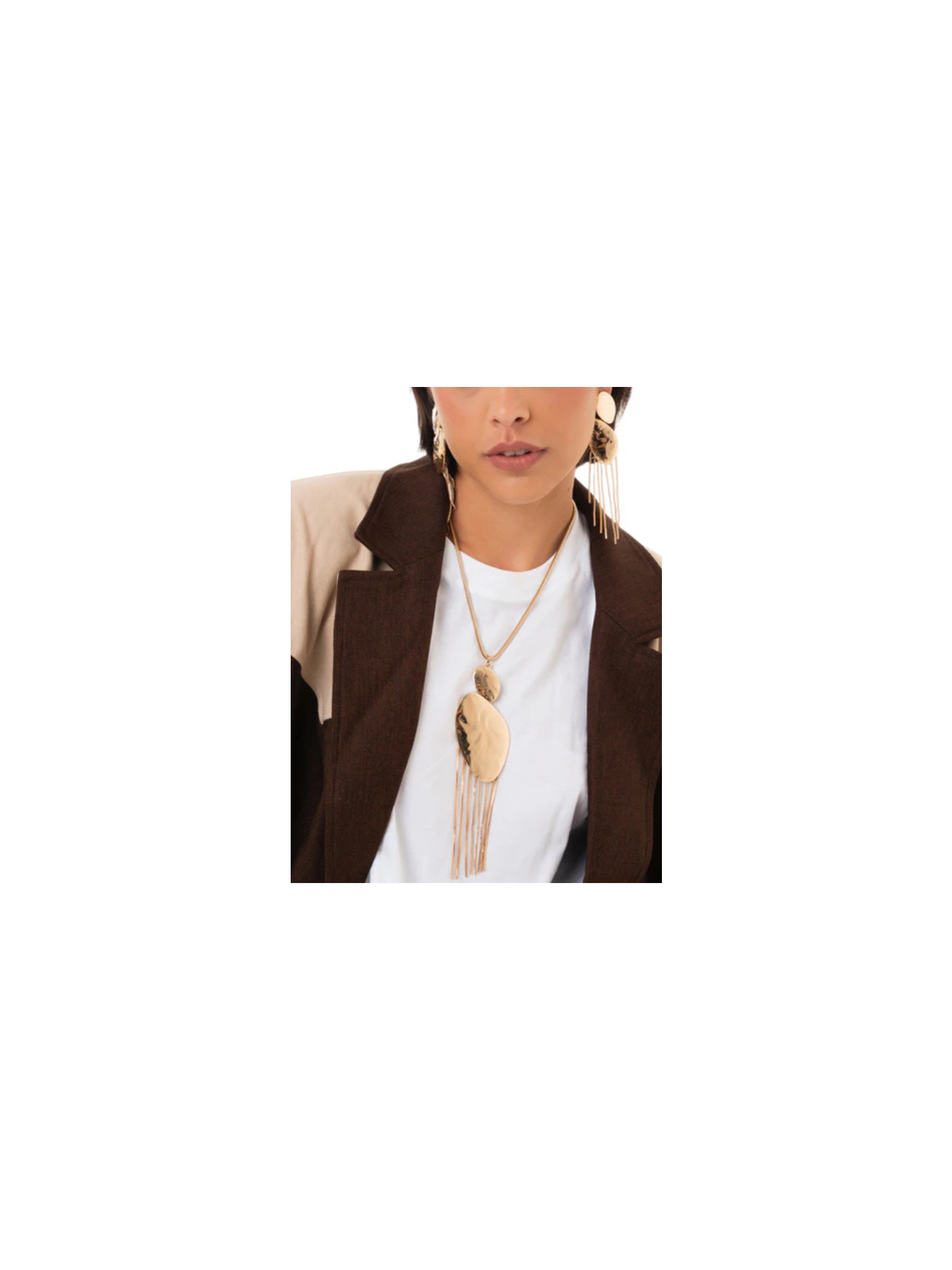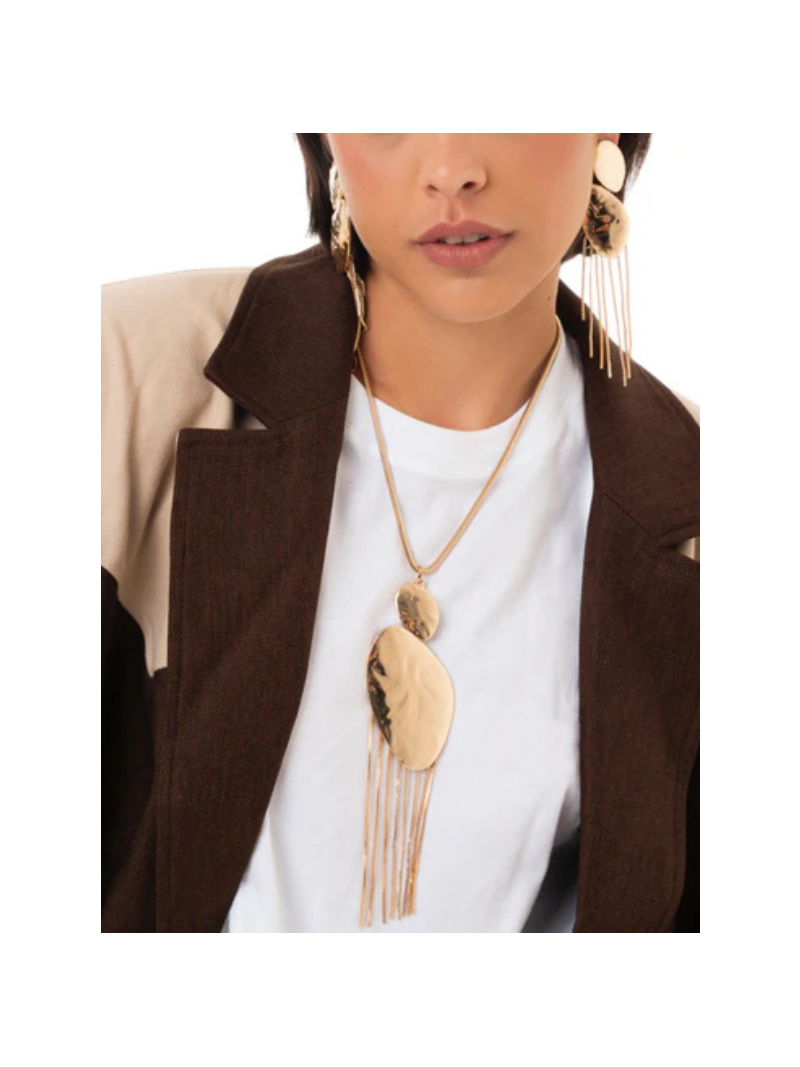 Collana snake con doppio medaglione ovale e fili metallici pendenti.