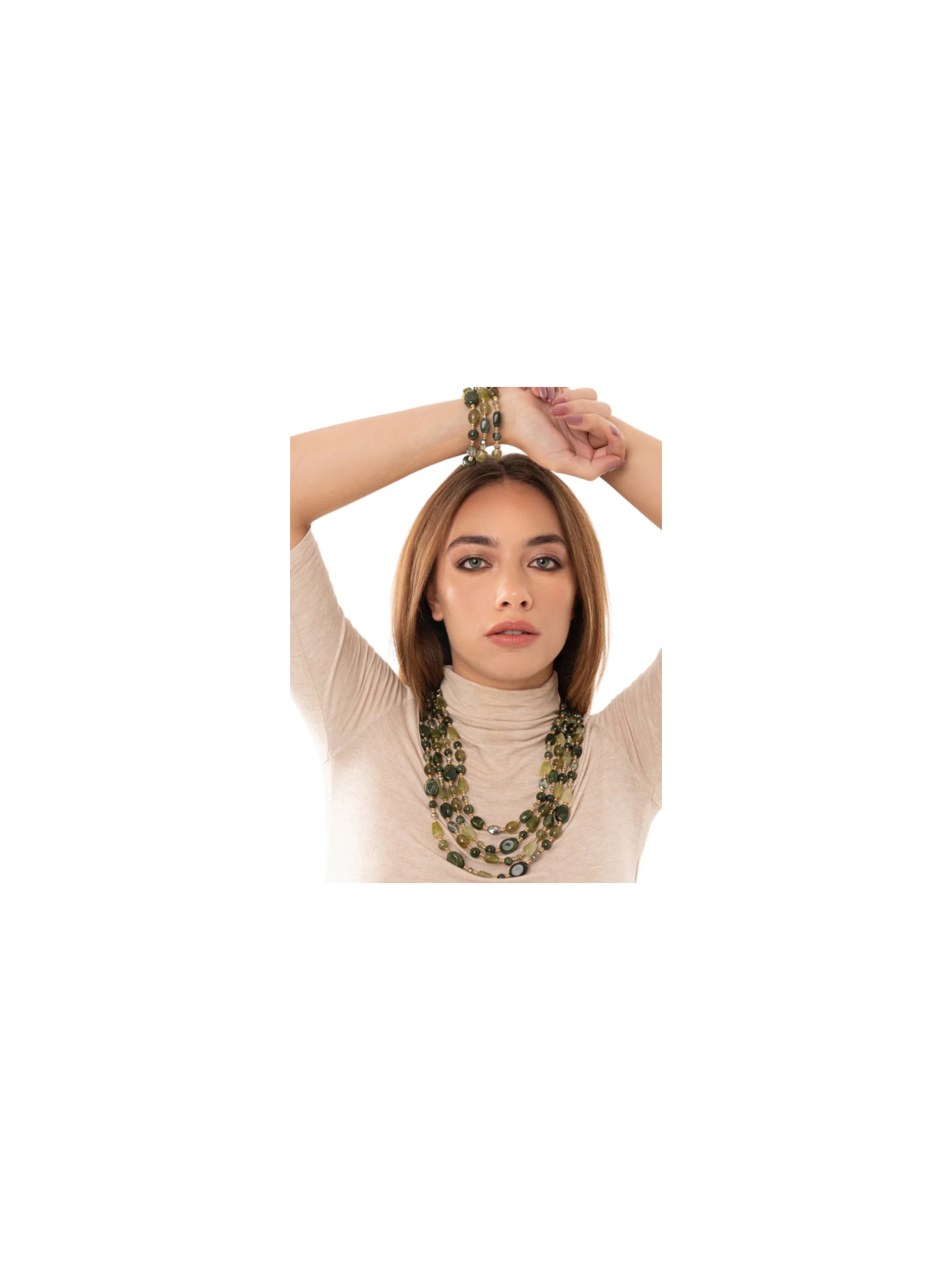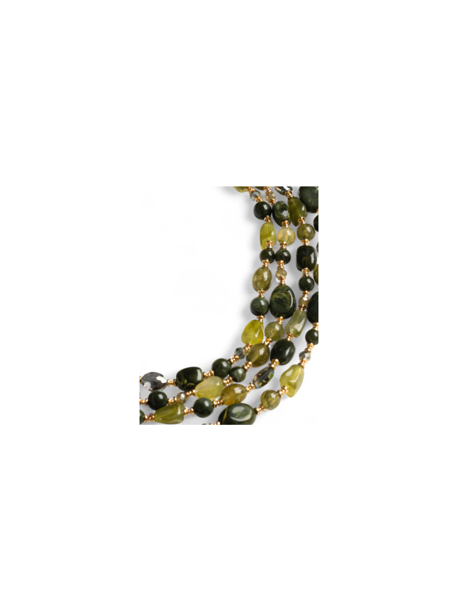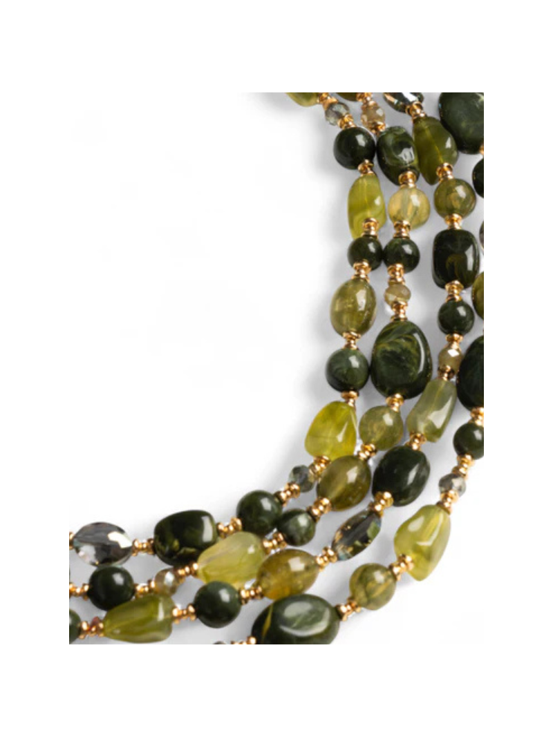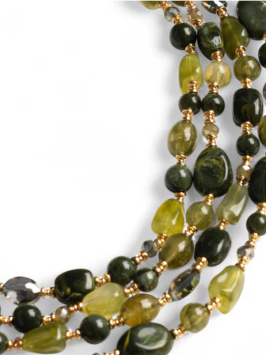 Collana girocollo a quattro linee con pietre in acrilico e verde sui toni del verde.