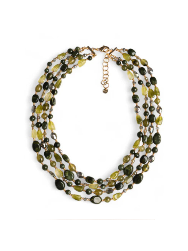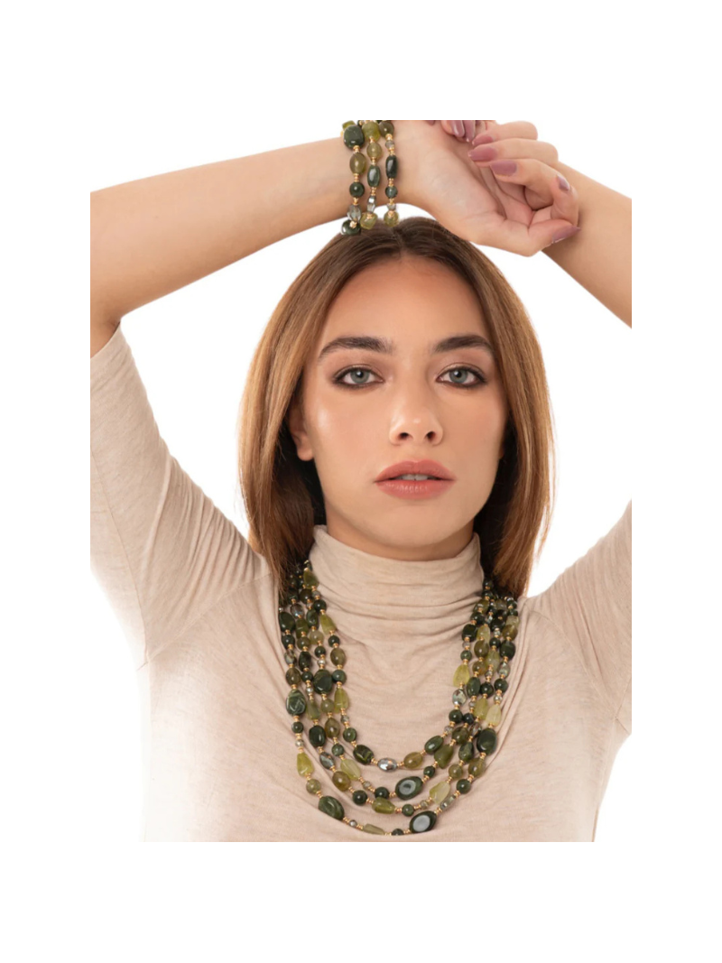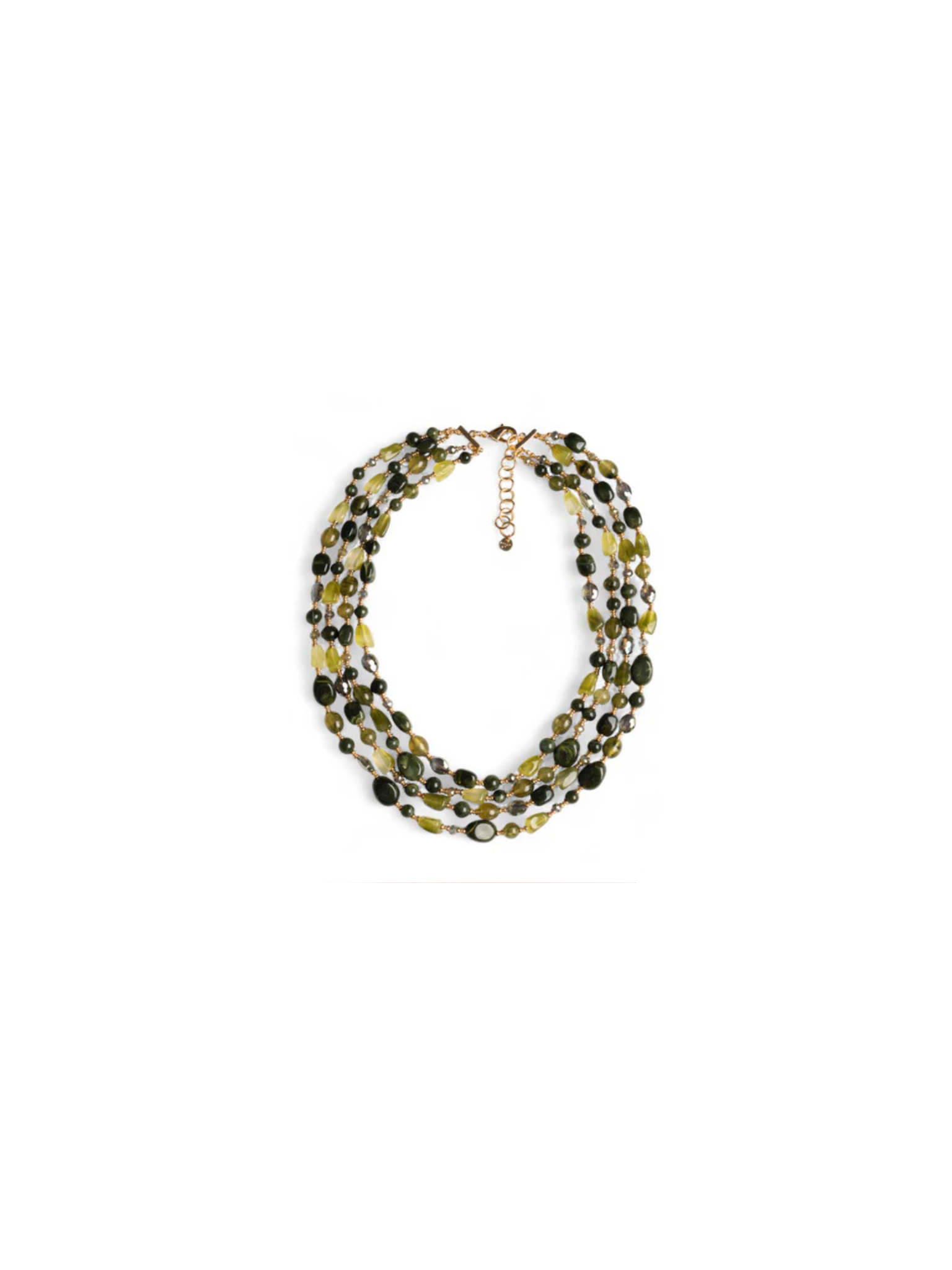 Collana girocollo a quattro linee con pietre in acrilico e verde sui toni del verde.