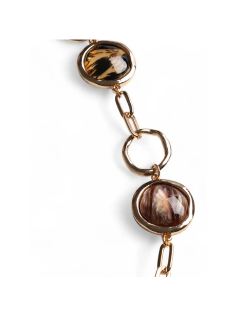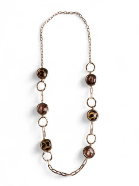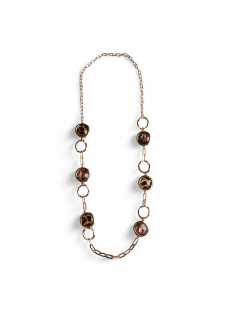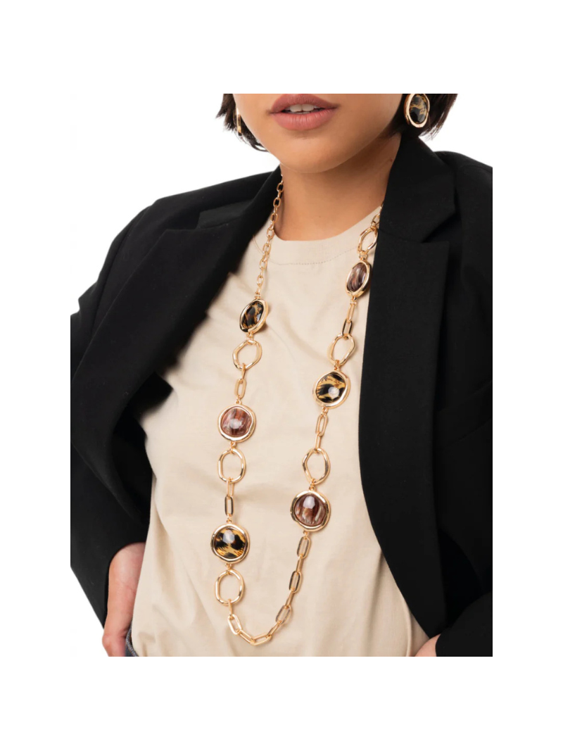 Collana lunga a catena con inserti circolri in acrilico leopardato.