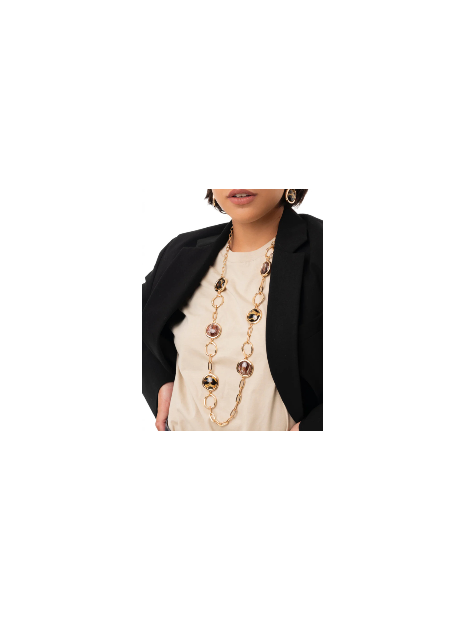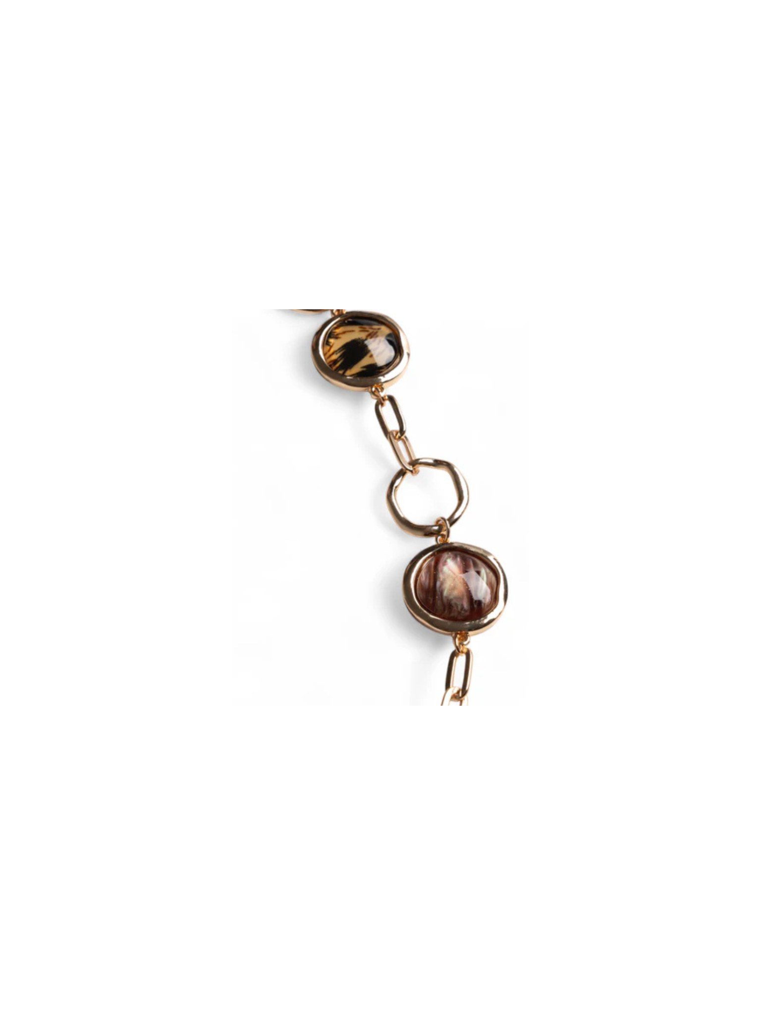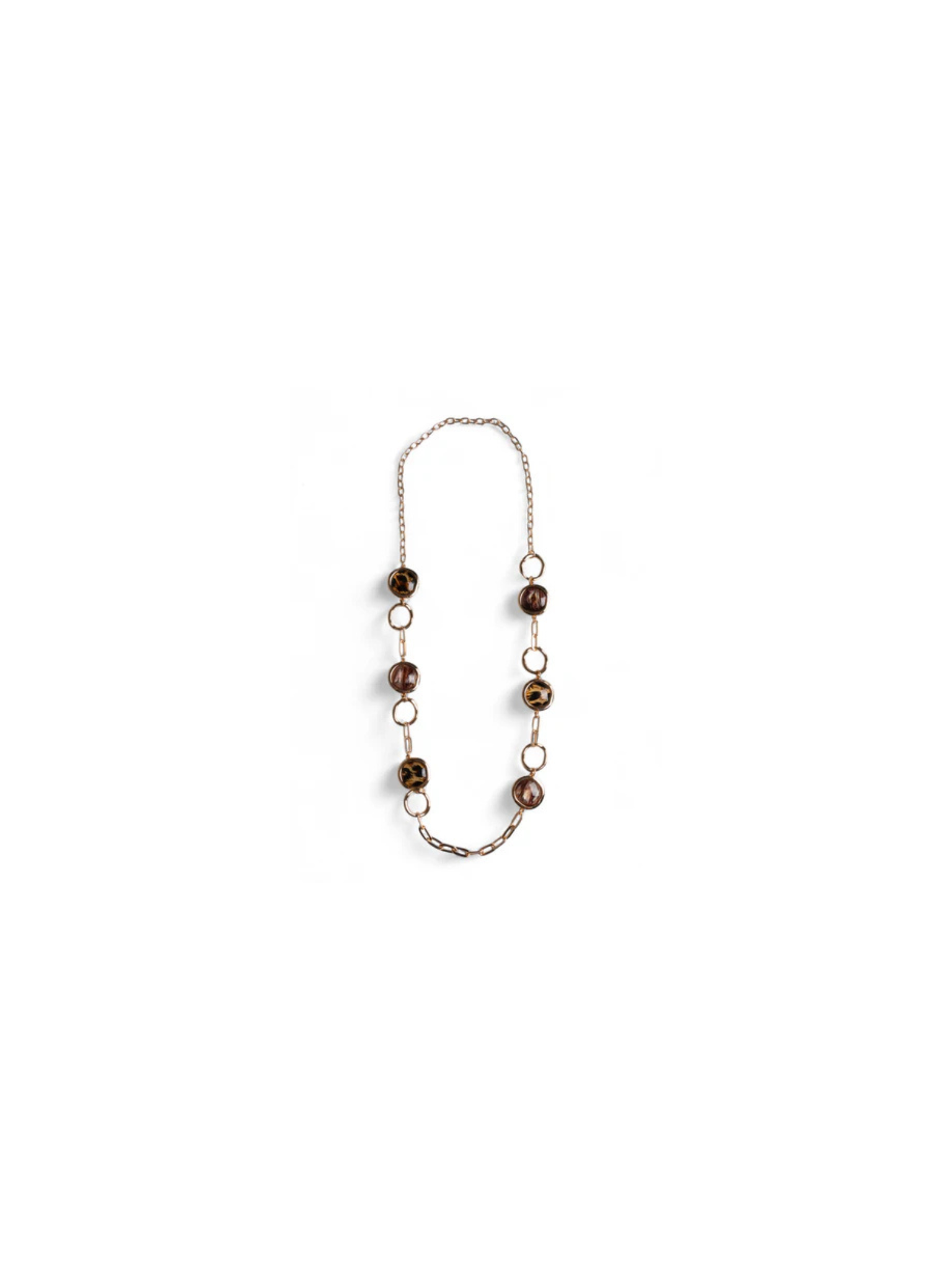 Collana lunga a catena con inserti circolri in acrilico leopardato.