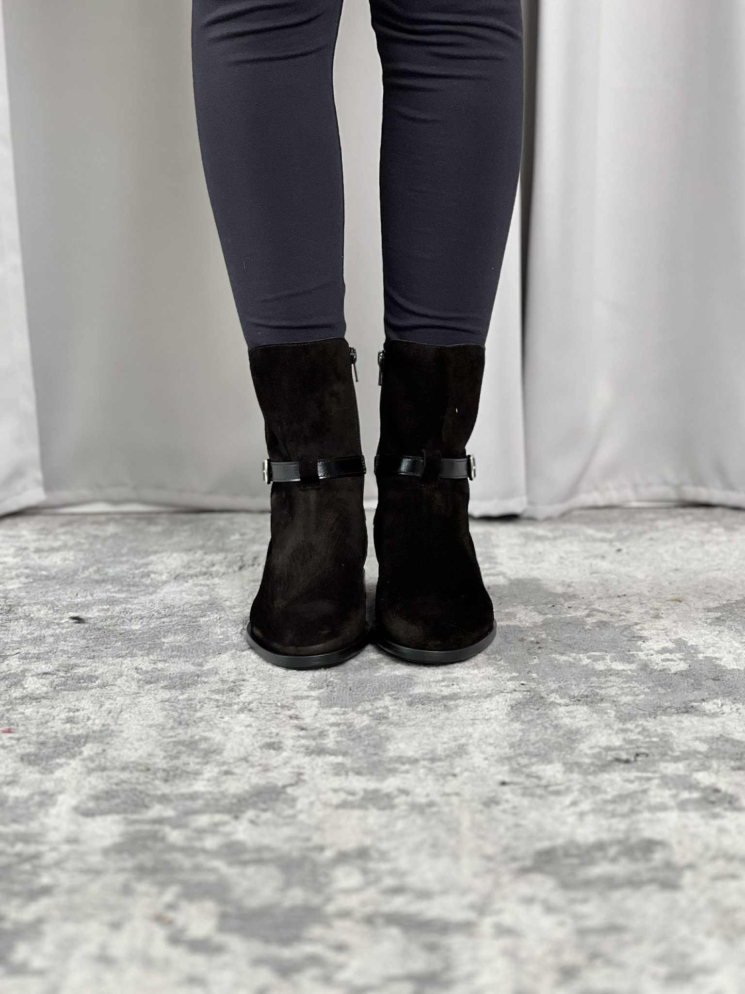 Tomaia in pelle scamosciata con cinturino decorativo in pelle lucida effetto creased, pratica zip interna