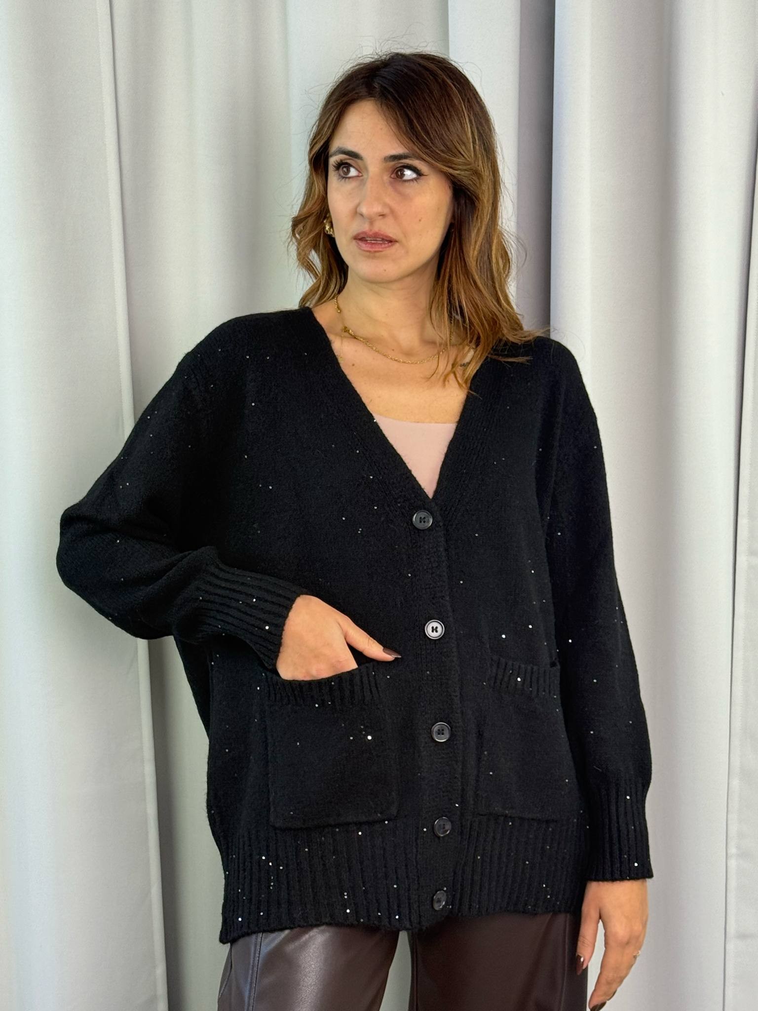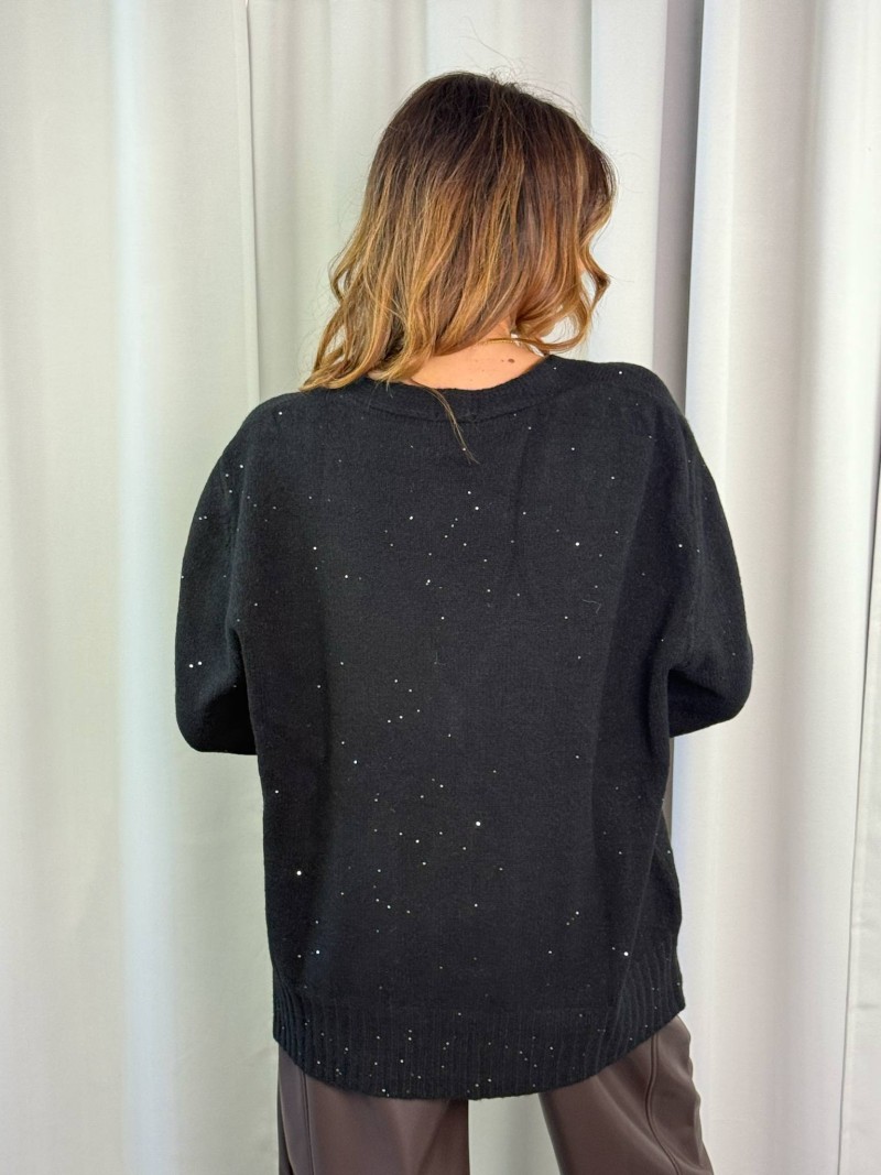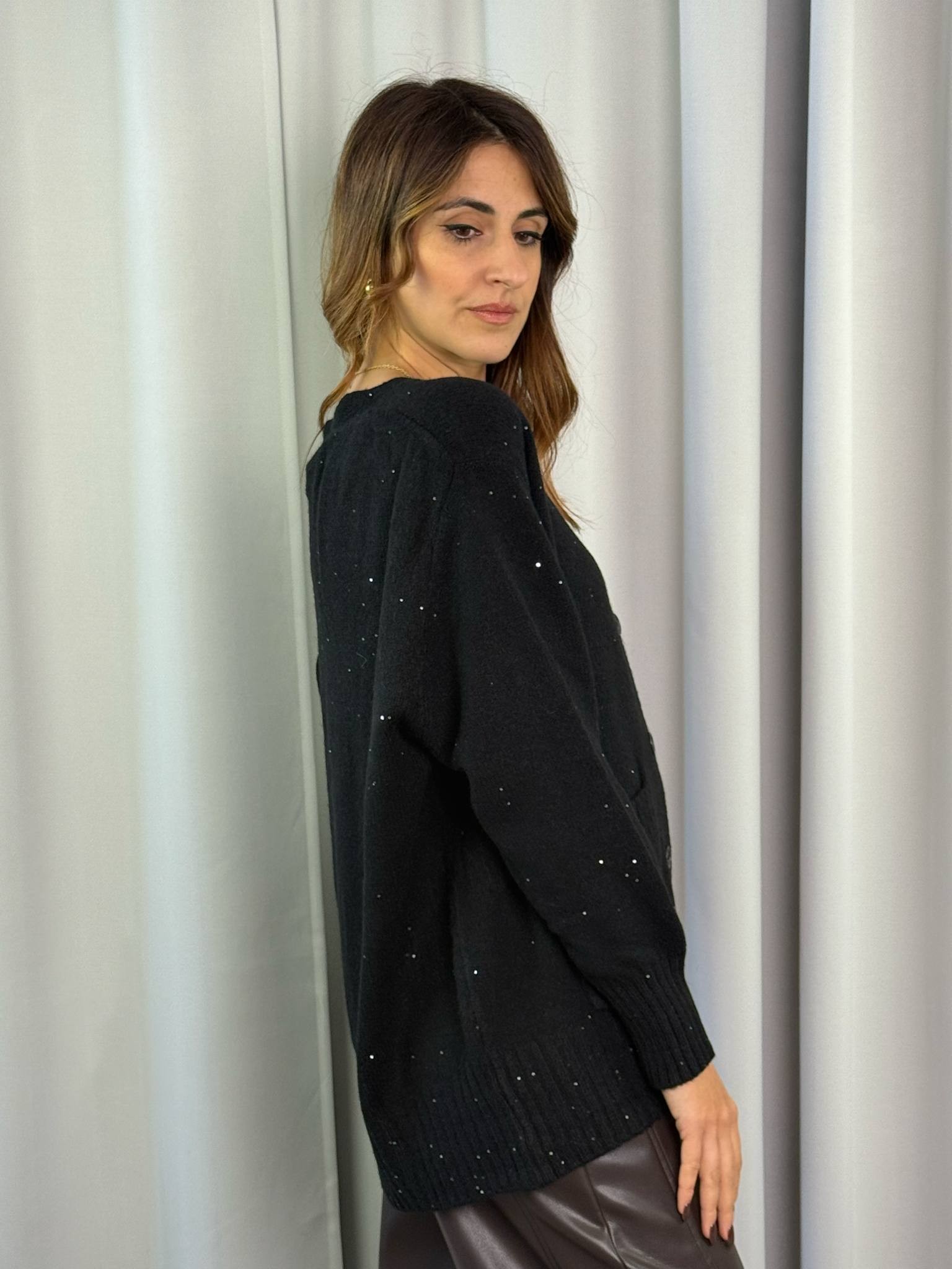 Cardigan a 5 bottoni con micropailletts Susy Mix color nero.